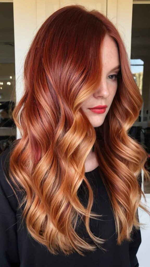 - Auburn balayage with soft waves