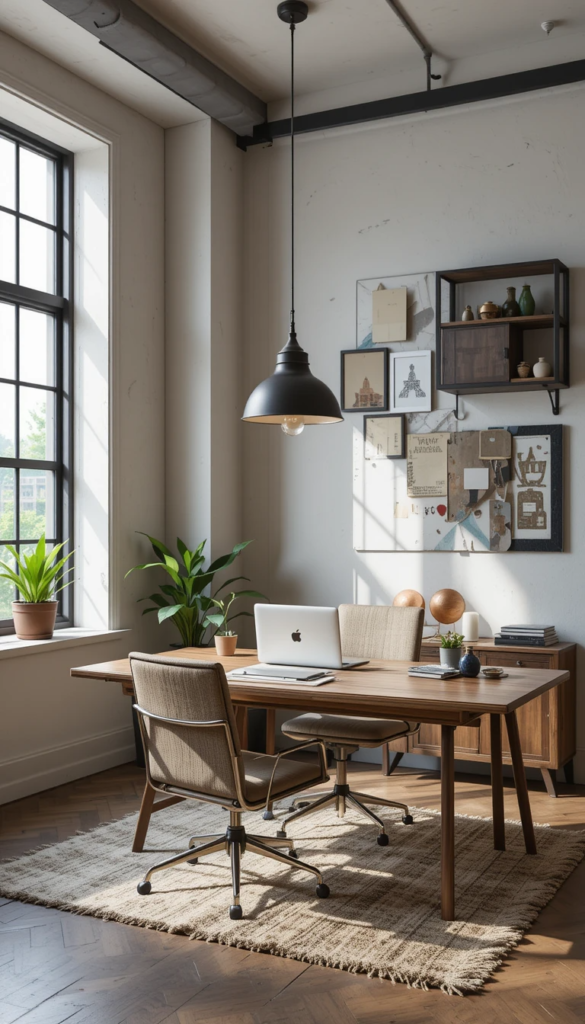 - Mid-Century Modern Office – Iconic furniture shapes, warmer woods, and vintage accents.