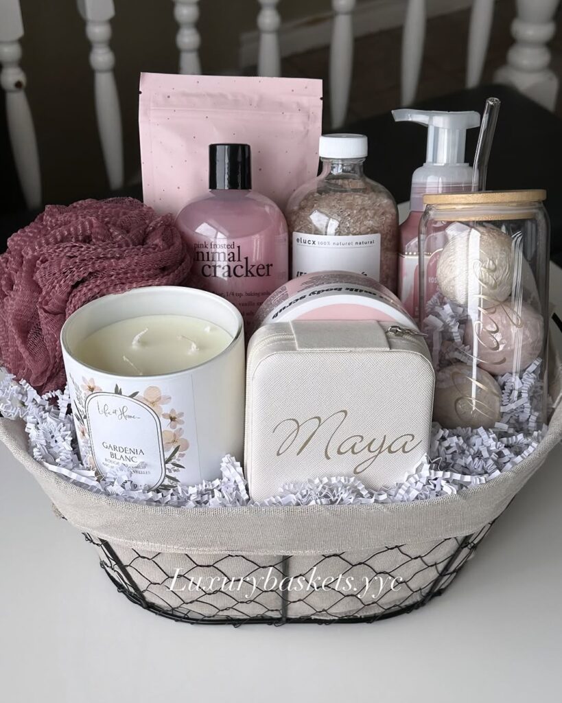 11. Luxury Spa Gift Basket – bath bombs, lotions, and essential oils.