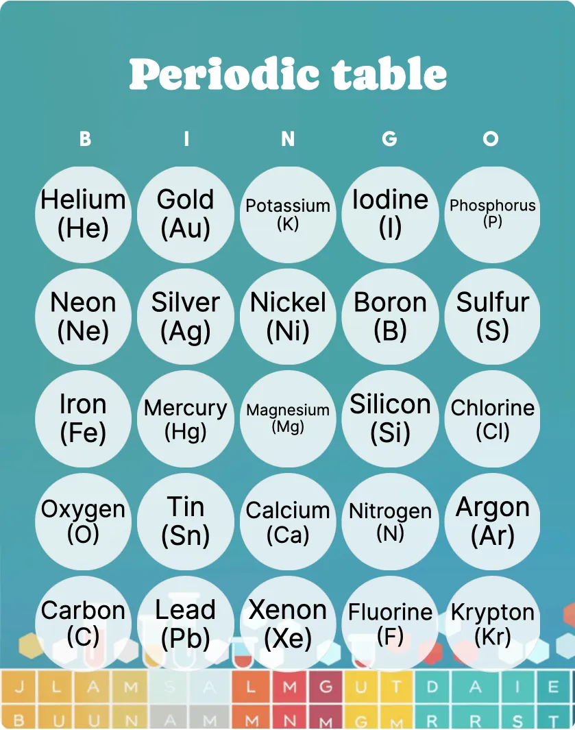 - Step 1: Prepare a bingo card with the names of elements or symbols.