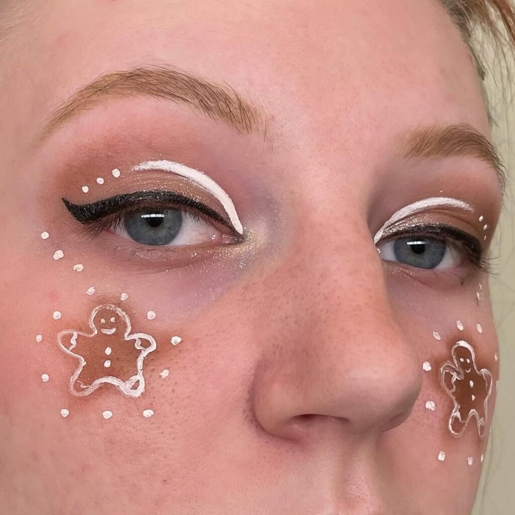 - Utilize brown confront paint or eyeliner to draw little gingerbread men over your nose and cheeks.