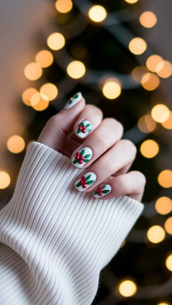 - Holly Berries Art – A nude base with green leaves and red berries hand-painted.