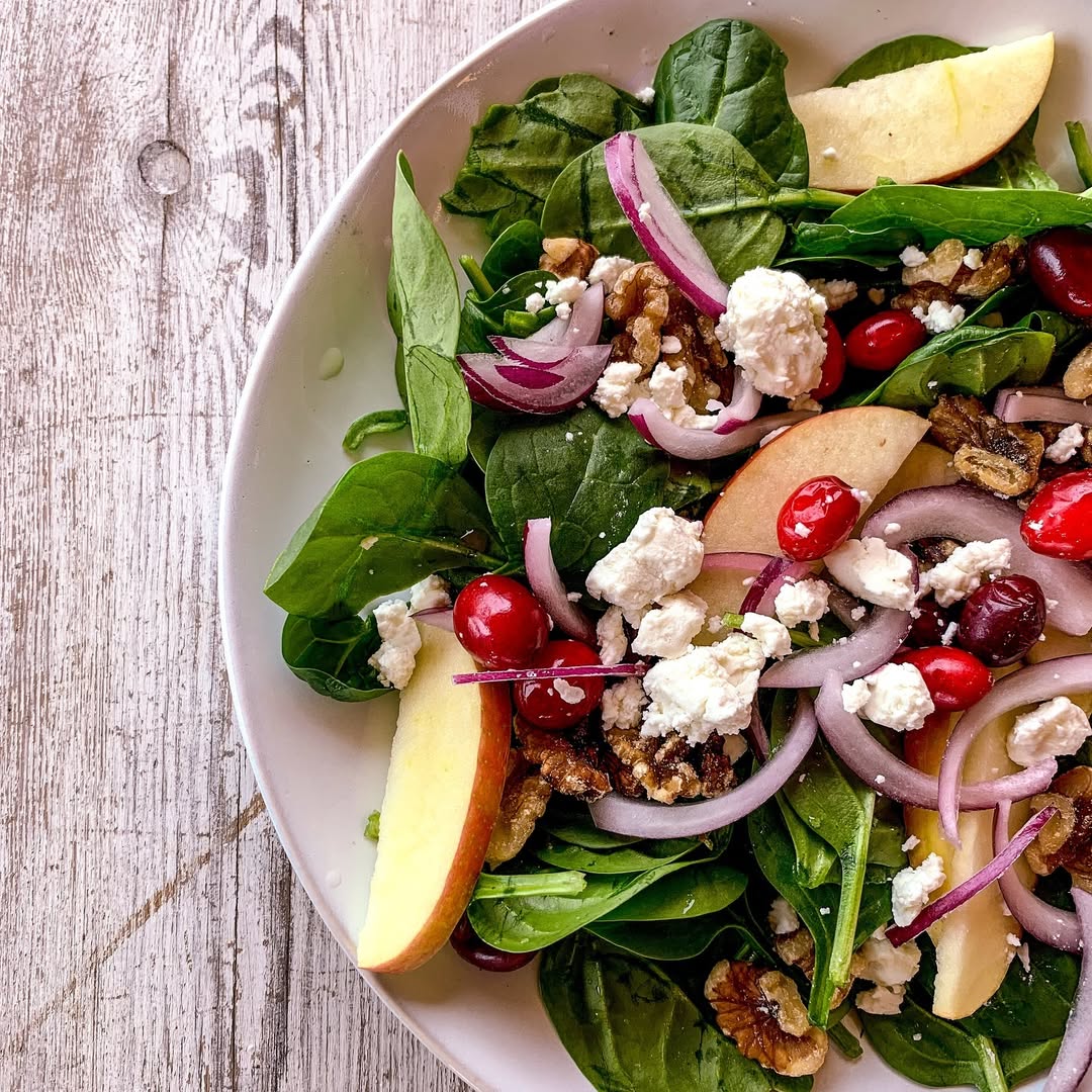 1. Spinach, cranberry, walnut, and goat cheese salad