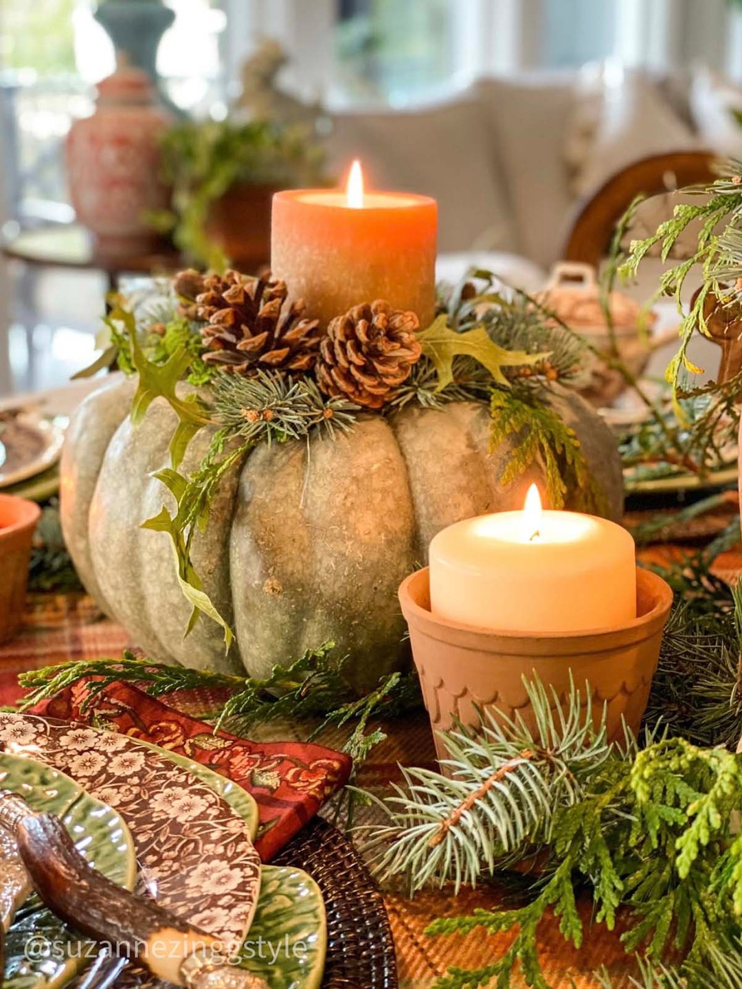 - Place the smaller pumpkins, pine cones, and autumn leaves on pumpkin on a tray or a table runner.