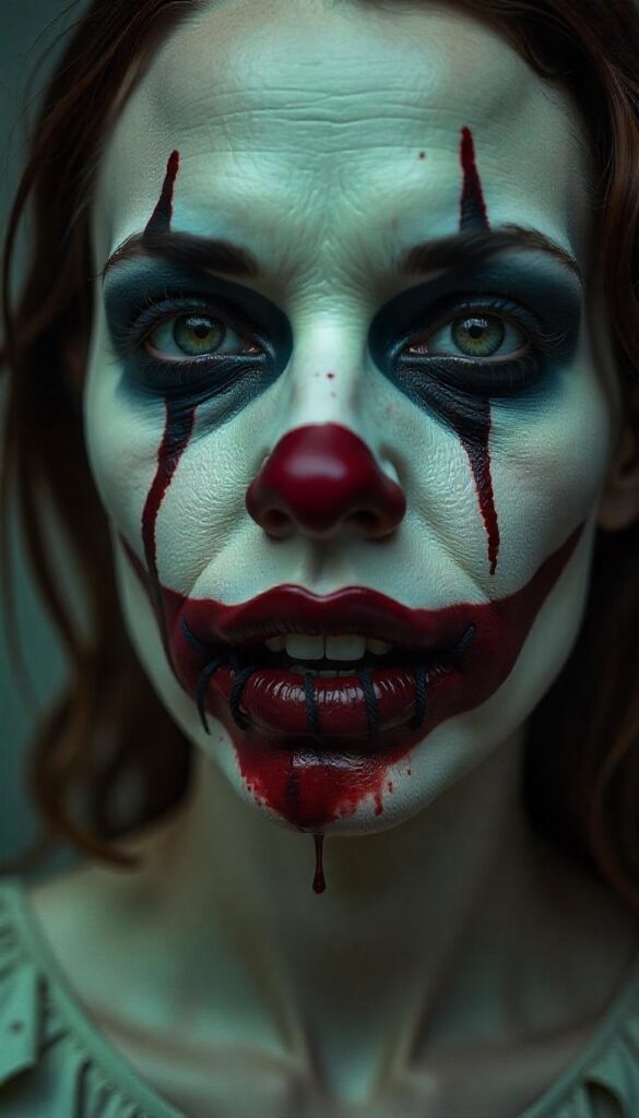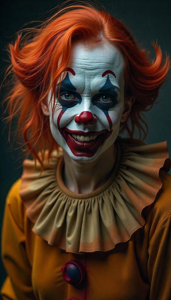 - Include clown highlights like ruddy nose and painted mouth—twisted by “burns.”