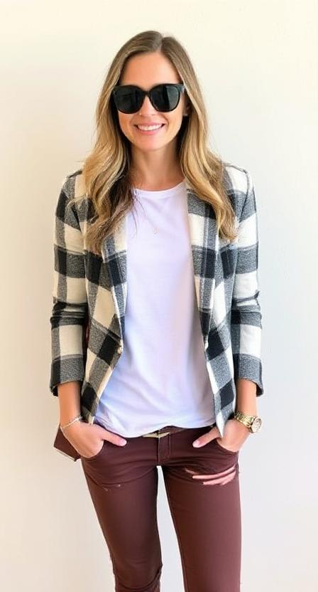 - Basic Tee & Plaid Blazer — A chic, business-casual look for fall.