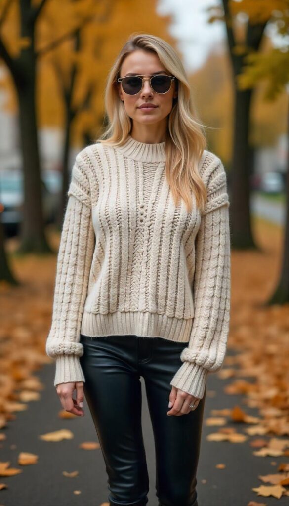 - Chunky Knit + Leather Pants — Gives cozy vibes but also looks modern and edgy.