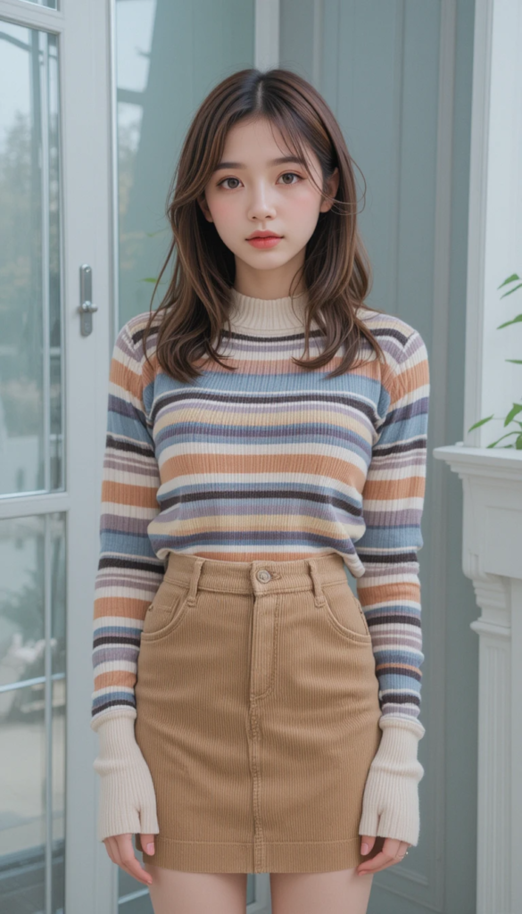 - Neutral Knit Sweater & Flowy Skirt – A well-rounded, smooth autumn ensemble.