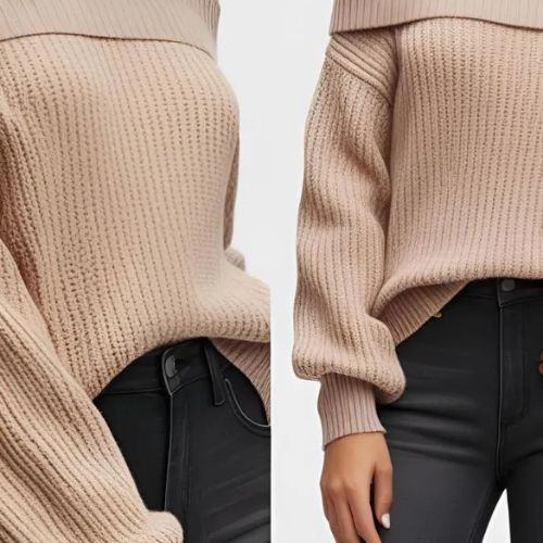 - Balancing the bulky top requires either tucking or cropping the knit.