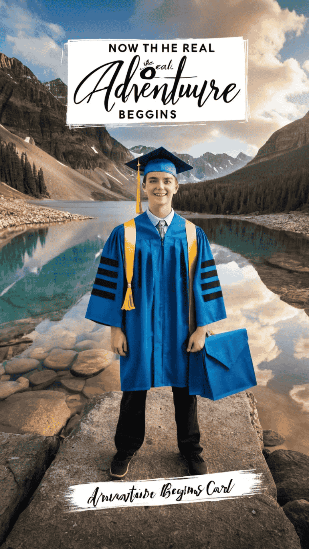 - Add quotes: “Now the real adventure begins” in front and center.
