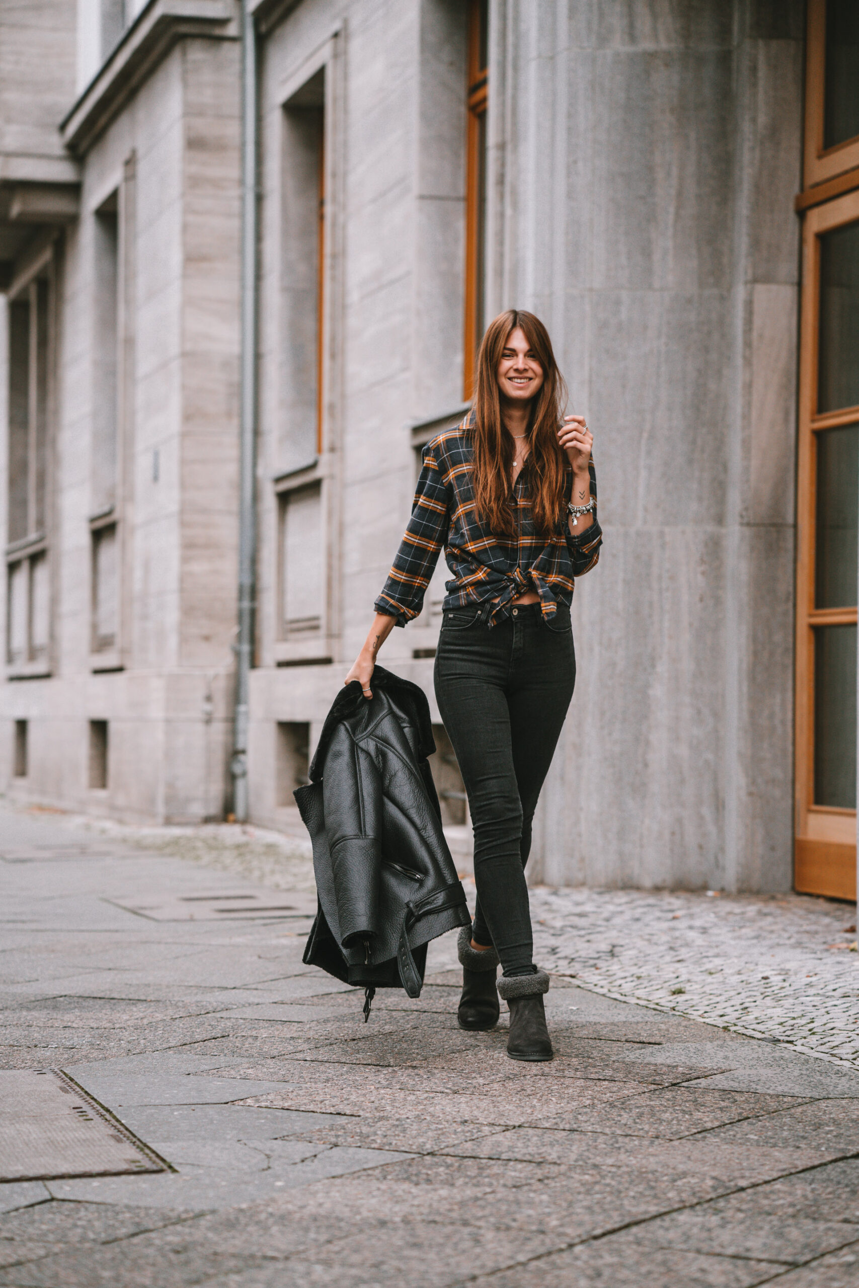 5. Oversized Plaid Shirt with Boots