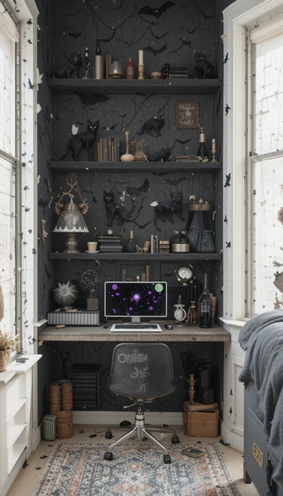 - Witch’s Corner: Create a corner with a cauldron, broomsticks, and potion bottles to look like a witch’s lair.
