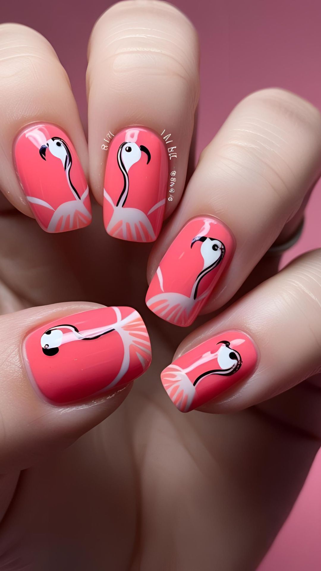 - Draw flamingo shapes on your nails either manually or use decorative decals and stamps.