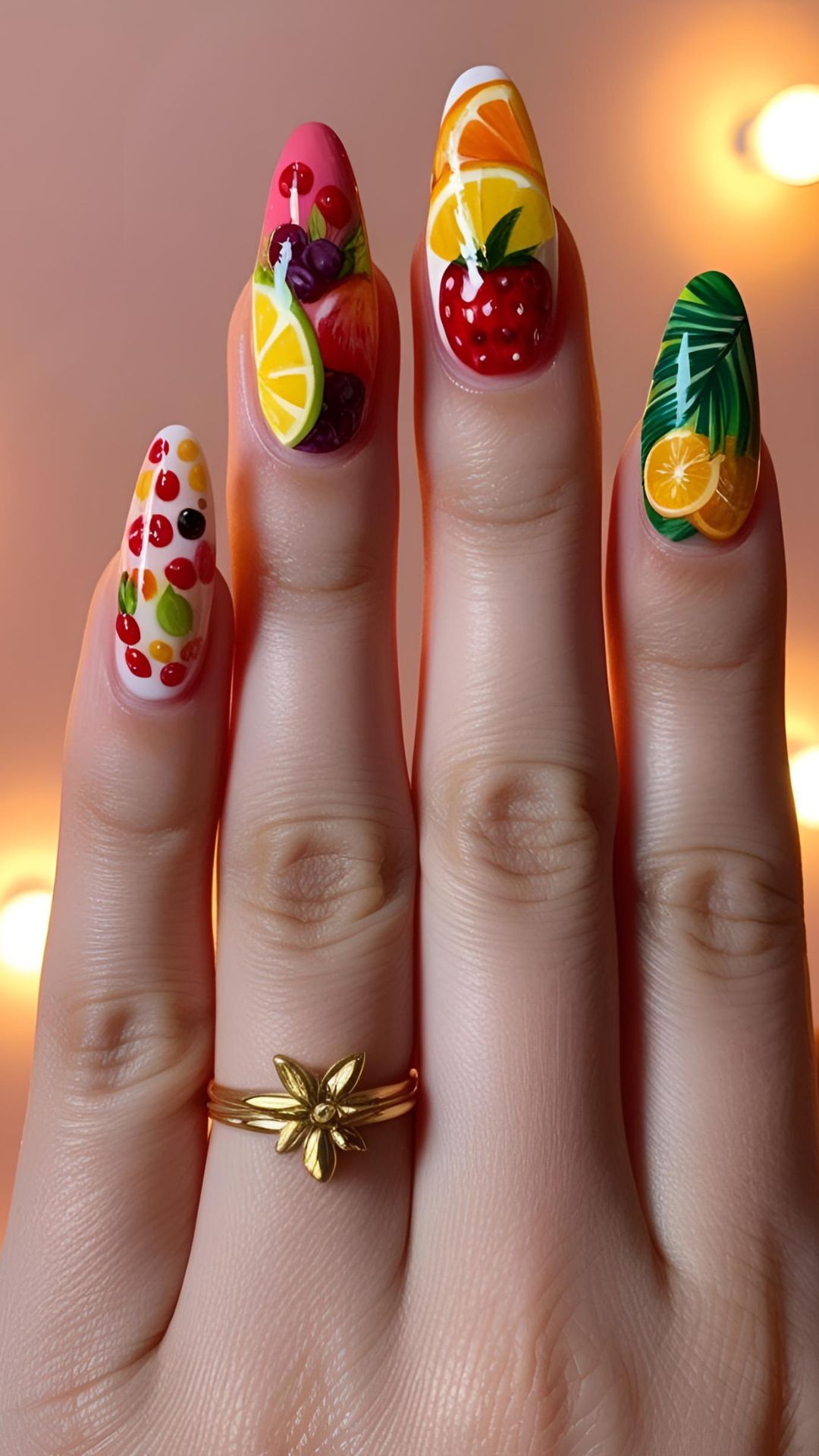 - Tropical Fruit Mix — different fruit on each nail (banana, mango, etc.).