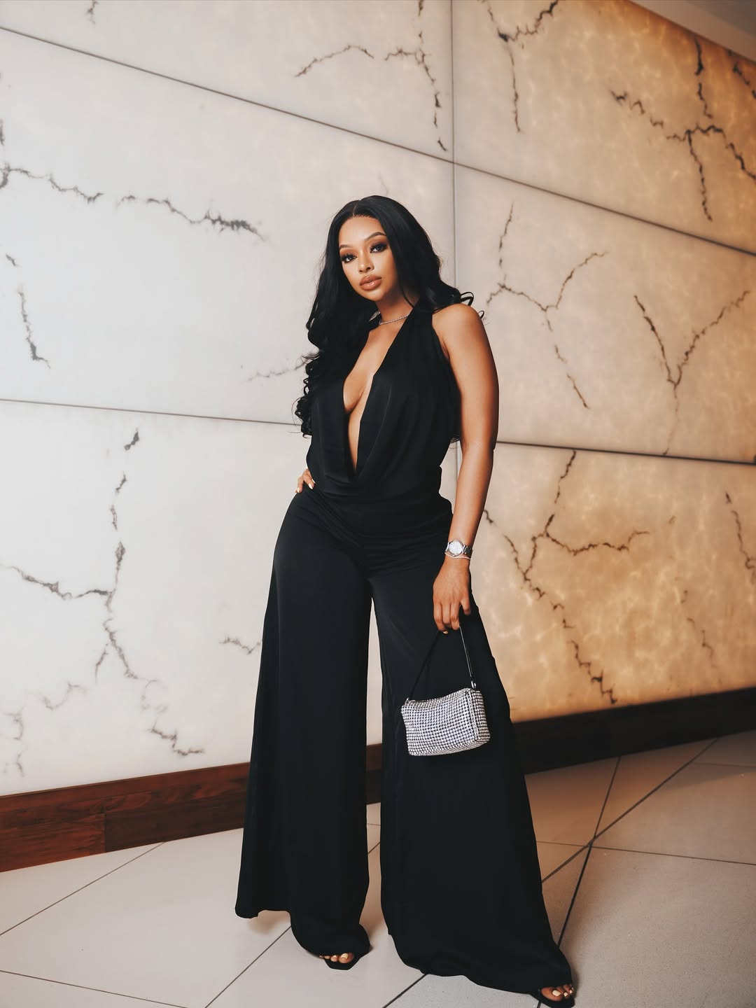 - Black satin jumpsuit