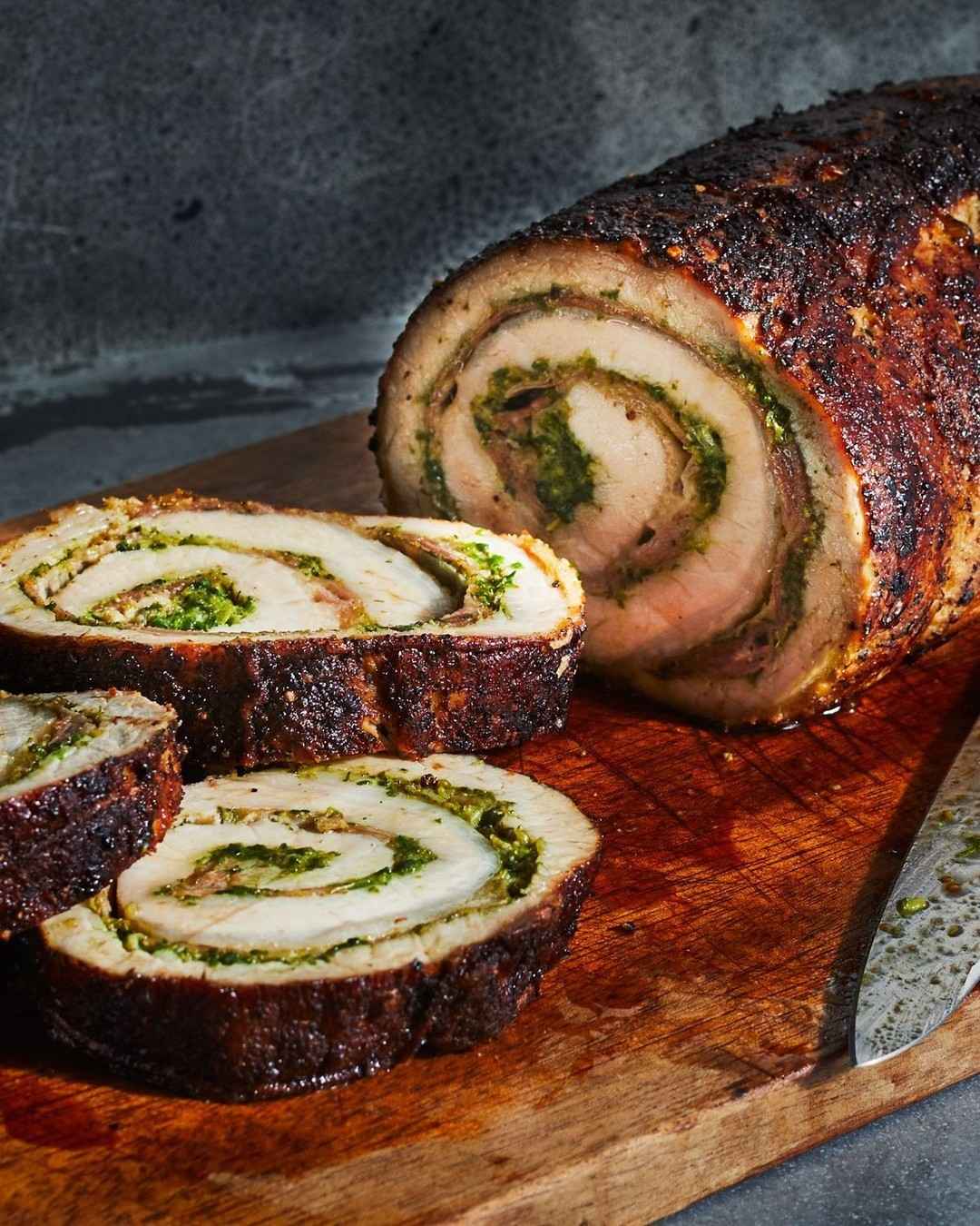 Stuff the pork loin by preheating the oven and butterflying the pork loin.