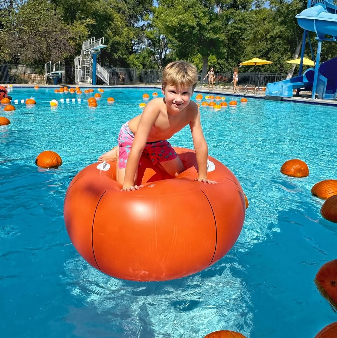 Floating mini pumpkins in the pool