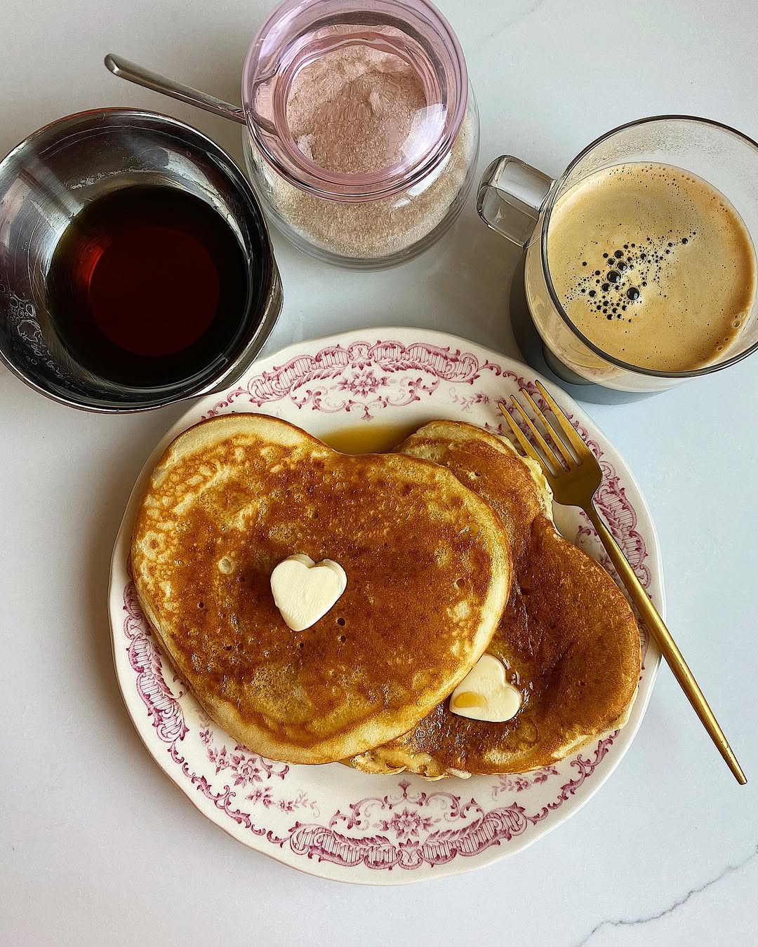 - Classic heart-shaped pancakes with maple syrup