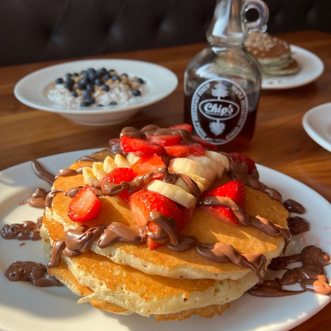 - Chocolate-dipped strawberry pancakes