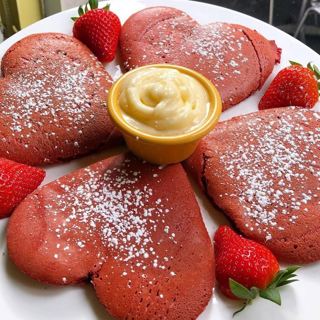 - Red velvet heart pancakes with cream cheese drizzle