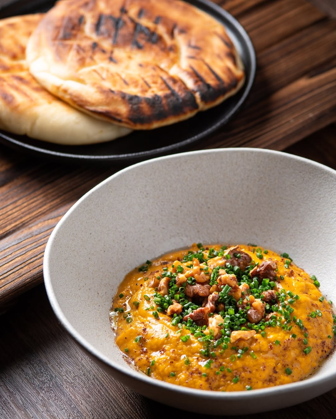 - Combine roasted pumpkin and 1 can of chickpeas, tahini 2tbsp, garlic 2 cloves, lemon juice, and olive oil.