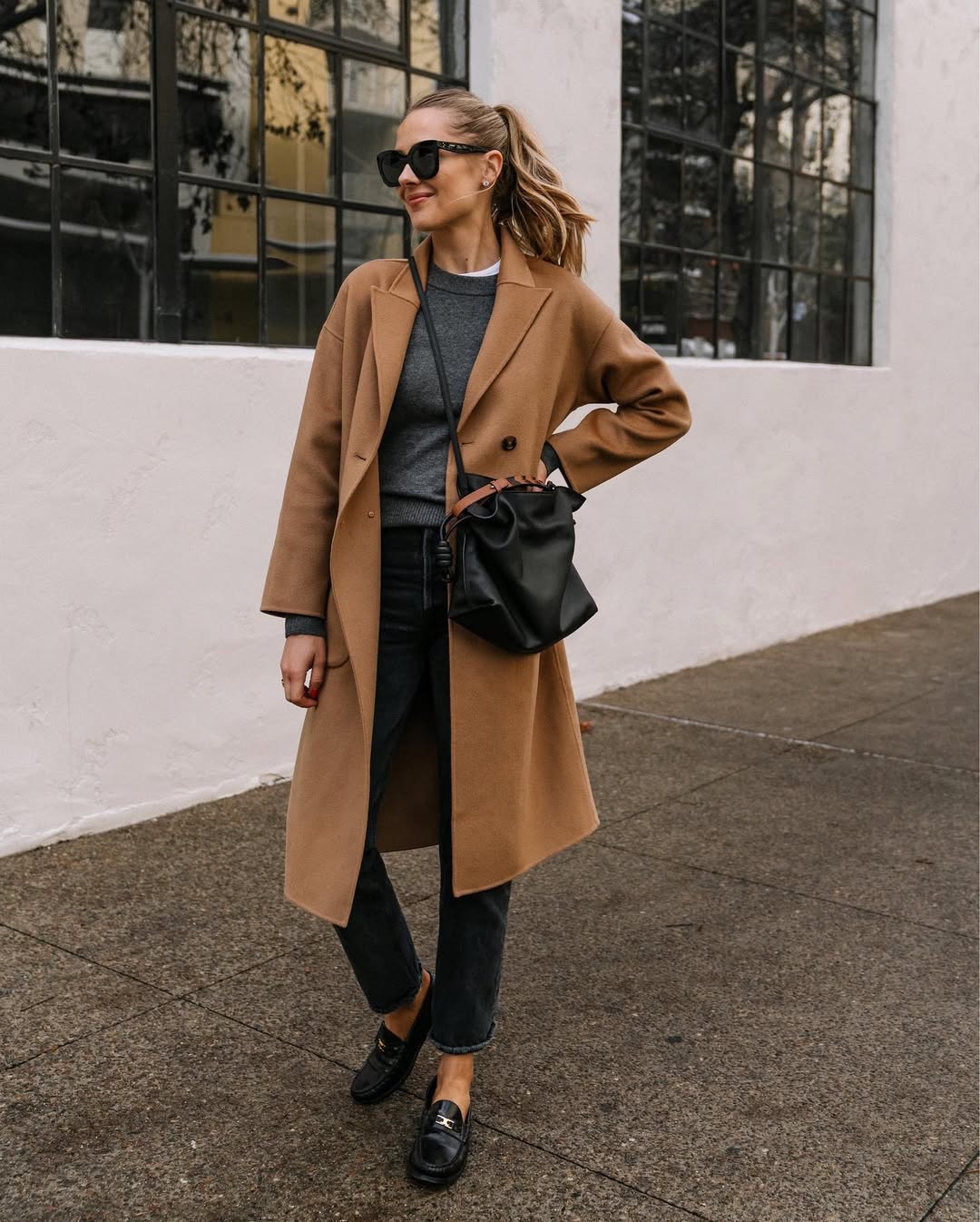 - Oversized camel coat with skinny jeans