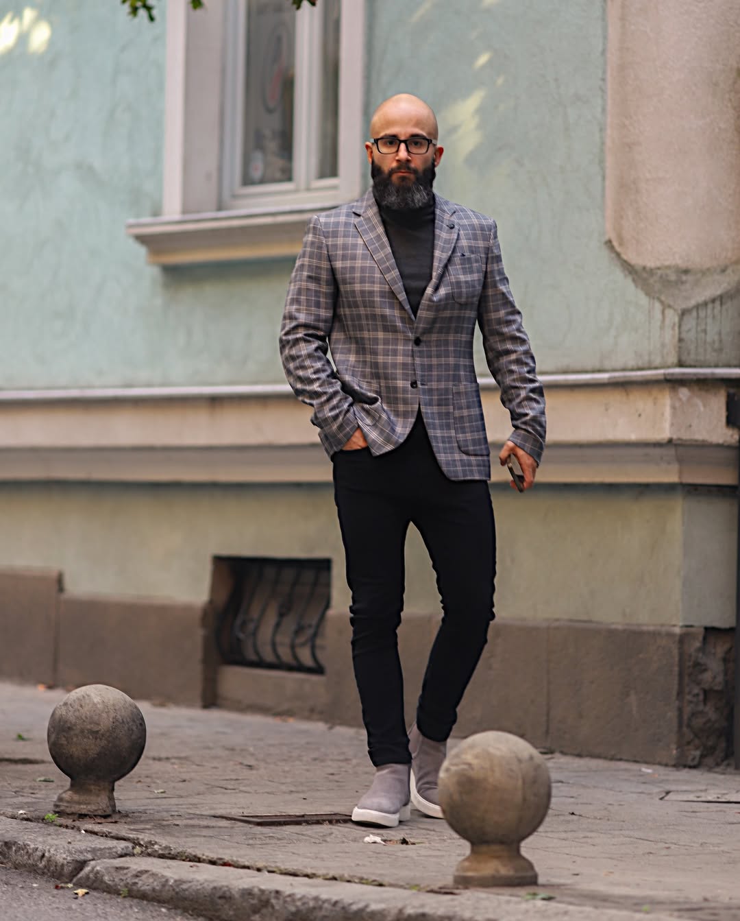 - Turtleneck with plaid trousers and loafers