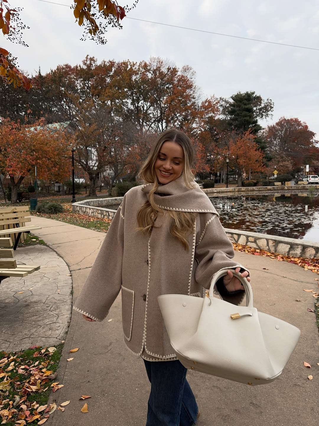 - Plaid scarf with oversized coat and jeans
